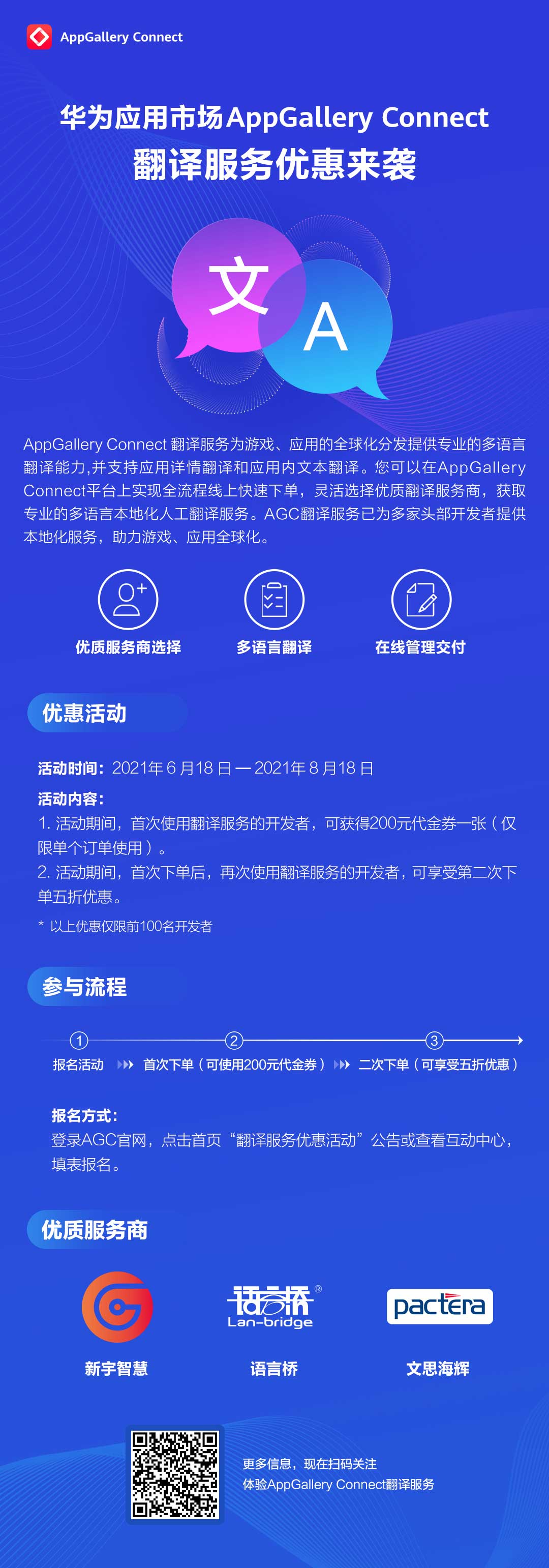 本次翻譯服務(wù)優(yōu)惠活動力度非常大?;顒悠陂g,首次使用翻譯服務(wù)的開發(fā)者,可獲得200元代金券一張,下單直接抵扣200元。首次下單完成后,開發(fā)者再次使用翻譯服務(wù),可以享受第二單五折的超大優(yōu)惠!(活動詳情請見海報)