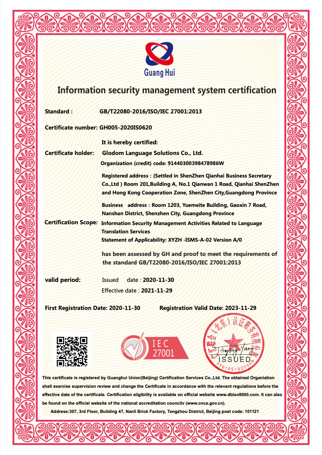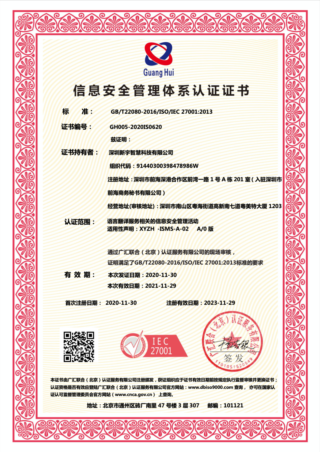 2020年11月,深圳新宇智慧科技有限公司正式通過了認(rèn)證標(biāo)準(zhǔn):ISO27001:2013。ISO27001它以嚴(yán)格的審查標(biāo)準(zhǔn)和權(quán)威的認(rèn)證體系,成為全球應(yīng)用最廣泛與典型的信息安全管理標(biāo)準(zhǔn),主要針對信息安全中的系統(tǒng)漏洞、黑客入侵、病毒感染等內(nèi)容進(jìn)行保護(hù)。此項證書的授予,充分說明了新宇智慧已經(jīng)建立了一套科學(xué)有效的信息安全管理體系,全面保障客戶的隱私及信息安全!