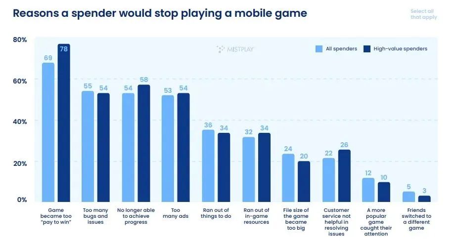 Moreover, players are increasingly averse to the "pay-to-win" model. The report indicates that more than 70% of users have left a game because they felt it was too "pay-to-win". Meanwhile, intrusive advertisements and progress systems lacking rewards are also important reasons for player churn. These issues have weakened players' stickiness to games and intensified their dissatisfaction with the industry as a whole.