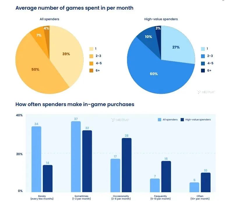 From the perspective of players' consumption habits, significant changes have taken place in in-app purchases in mobile games. High-spending players often spend money on multiple games, but overall, 39% of paying players only make purchases in one game per month. In addition, most players have postponed their first purchase time. More than 40% of players choose to make in-app purchases after the first week, which requires publishers to spend more time guiding players to pay.