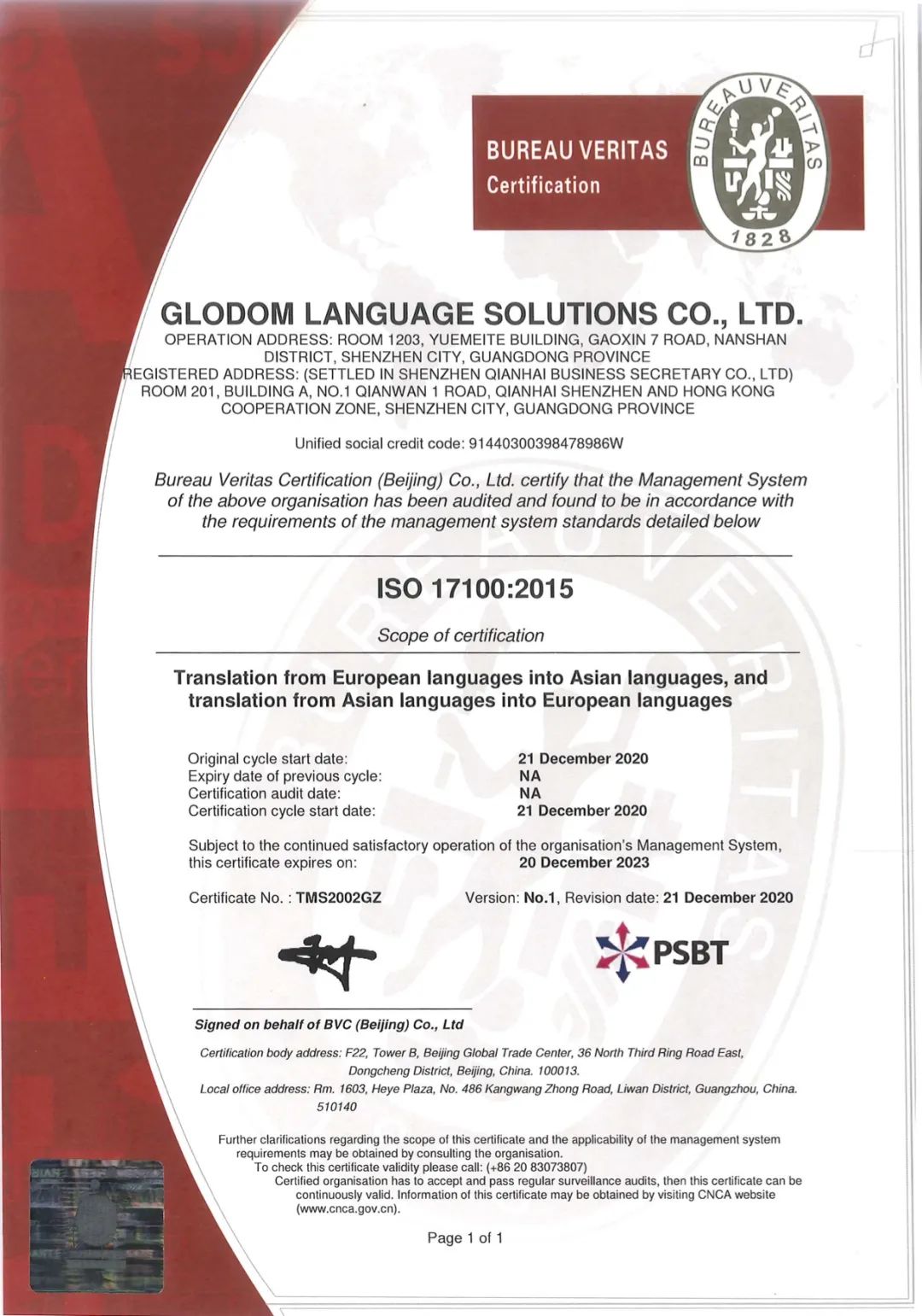 2020年尾聲,深圳新宇智慧科技有限公司正式通過了國際級的翻譯管理認(rèn)證標(biāo)準(zhǔn):ISO17100:2015。此項證書的授予,充分說明了新宇智慧無論從譯員水平、技術(shù)能力與服務(wù)質(zhì)量等各方面都嚴(yán)格遵循國際級最高翻譯的標(biāo)準(zhǔn),全方位保障客戶們在新宇智慧享受最優(yōu)質(zhì)的翻譯服務(wù)及解決方案。
