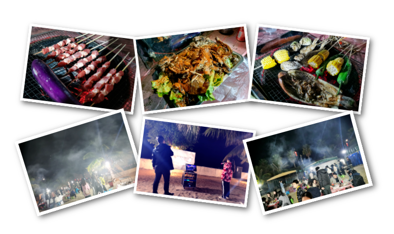天黑之后便是我們晚上的重頭戲——沙灘BBQ。大家圍坐在燒烤臺邊,許多同事的隱藏技能被開發(fā)出來,熟練的收拾著食材,有模有樣的烤串,吃著燒烤喝著啤酒,吹著海風唱著歌,推杯換盞,吃飽喝足,盡情歌唱,不亦樂乎。